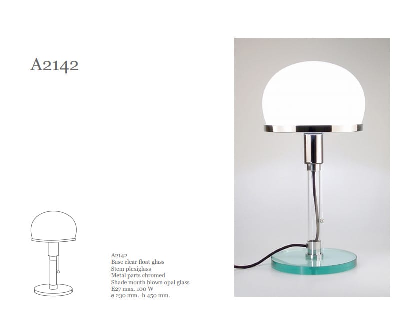 De Artimeta tafellamp 2142 komt uit de Bauhausperiode. Ontwerp van Karl Junker en Wilhelm Wagenfeld (1924). De lamp wordt met schakelaar in het snoer geleverd.